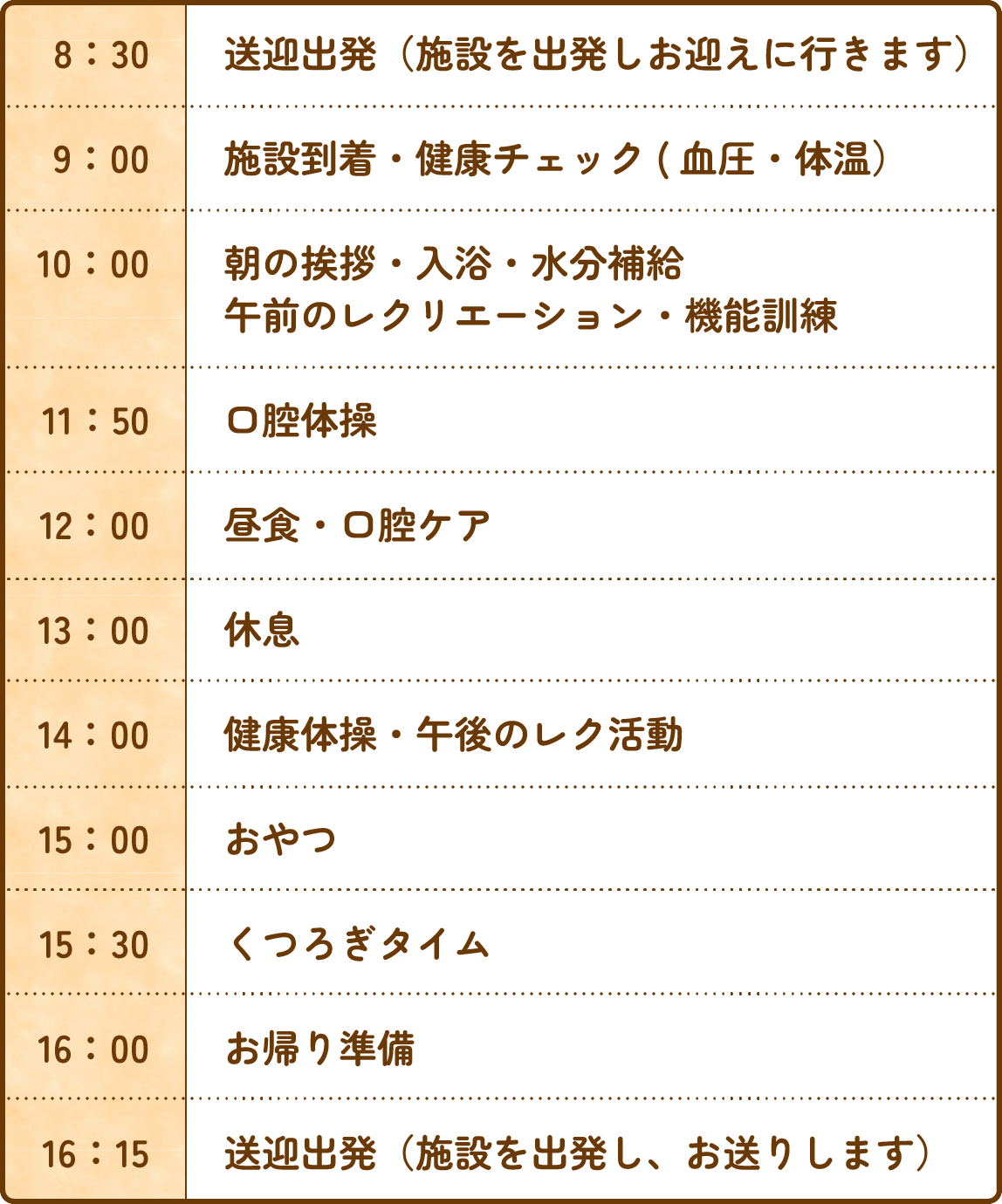 1日のサービスを主体とし、利用者様のニーズに合わせたサービス時間を提供します。